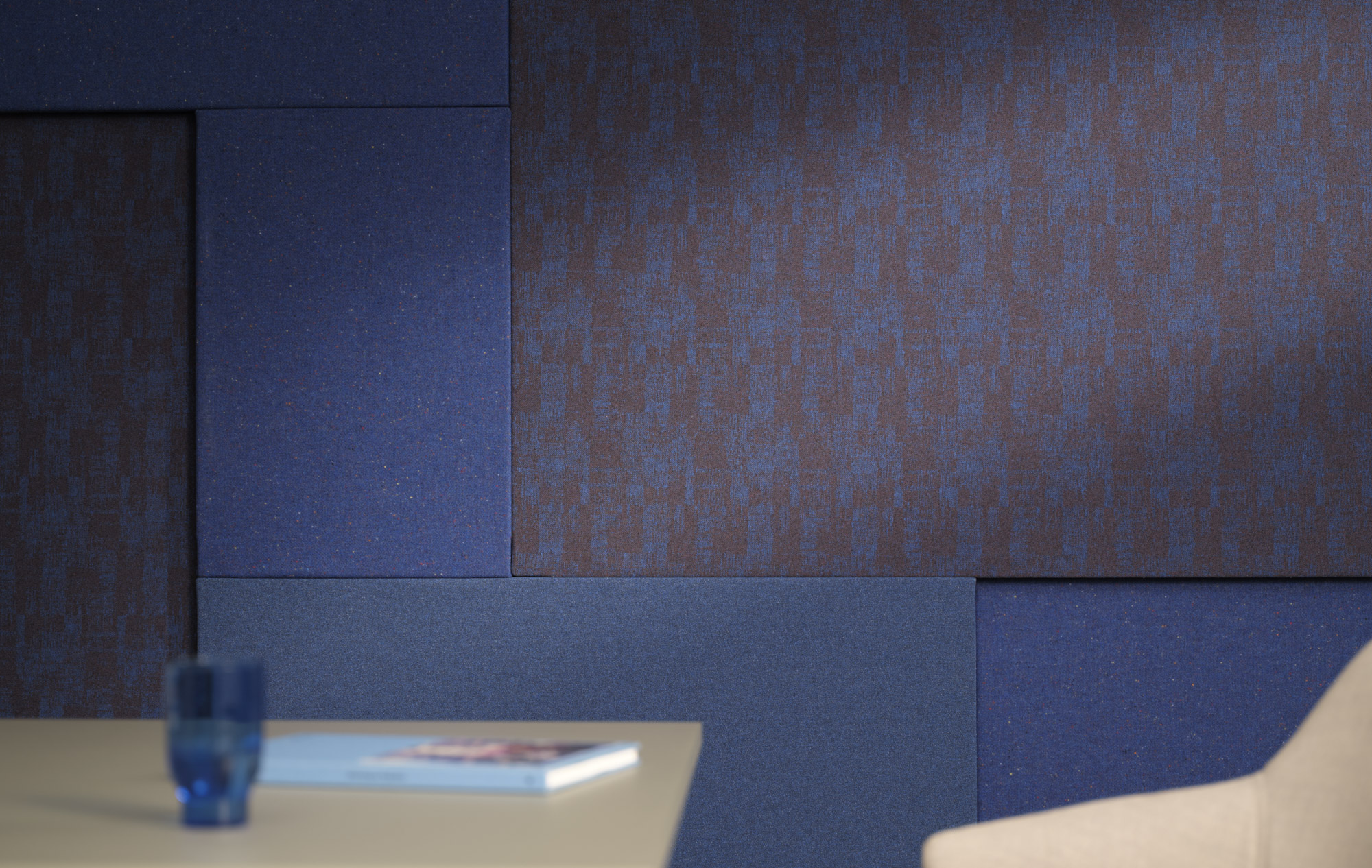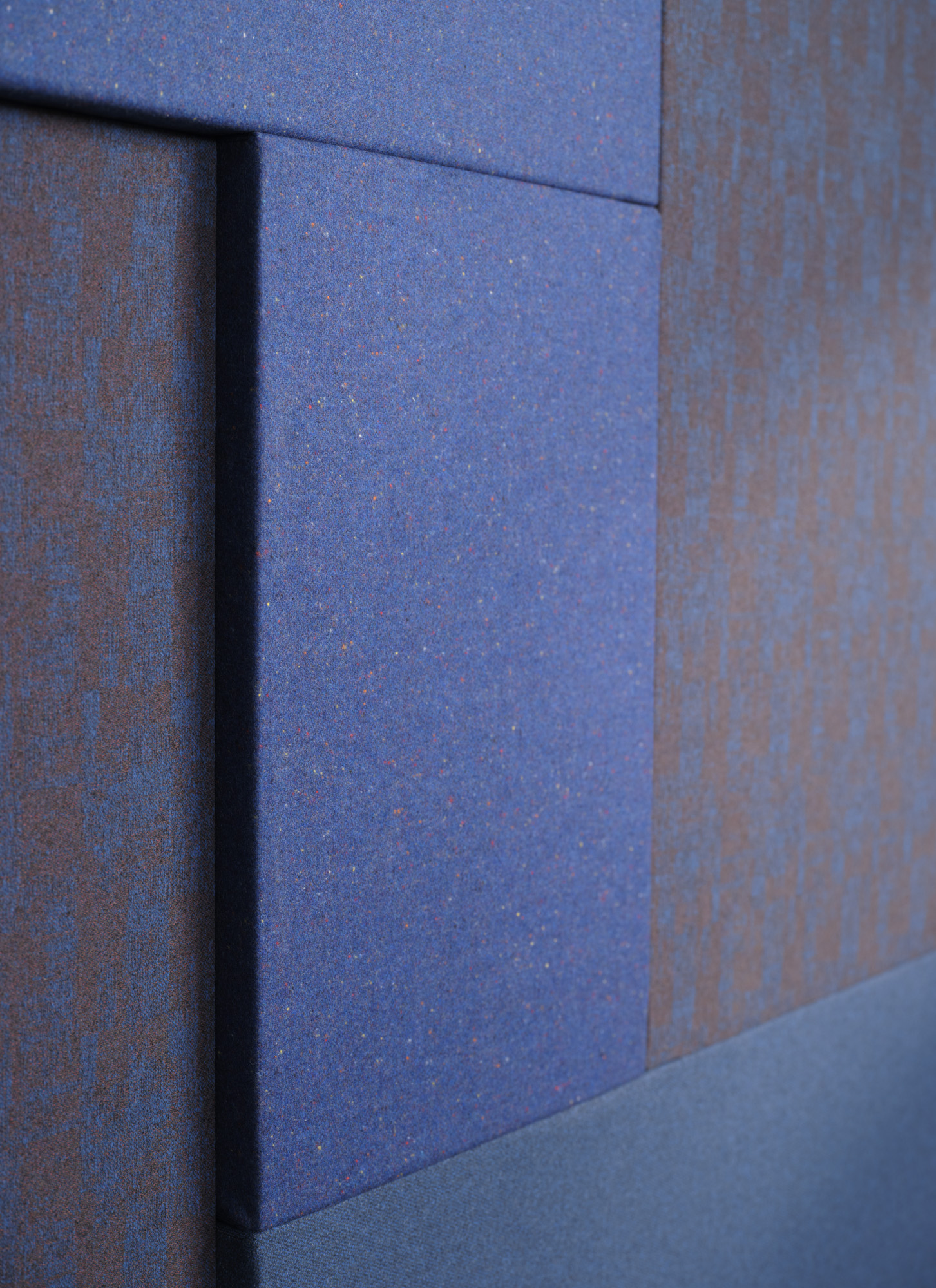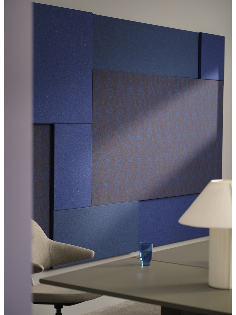 Back to all EDITsThis acoustic wall panel is both an eye-catcher and an effective tool for noise reduction. Each section is covered in a hand-picked acoustic fabric, with colours ranging from sky blue to midnight blue, and a mix of minimalistic and intricate weaves.