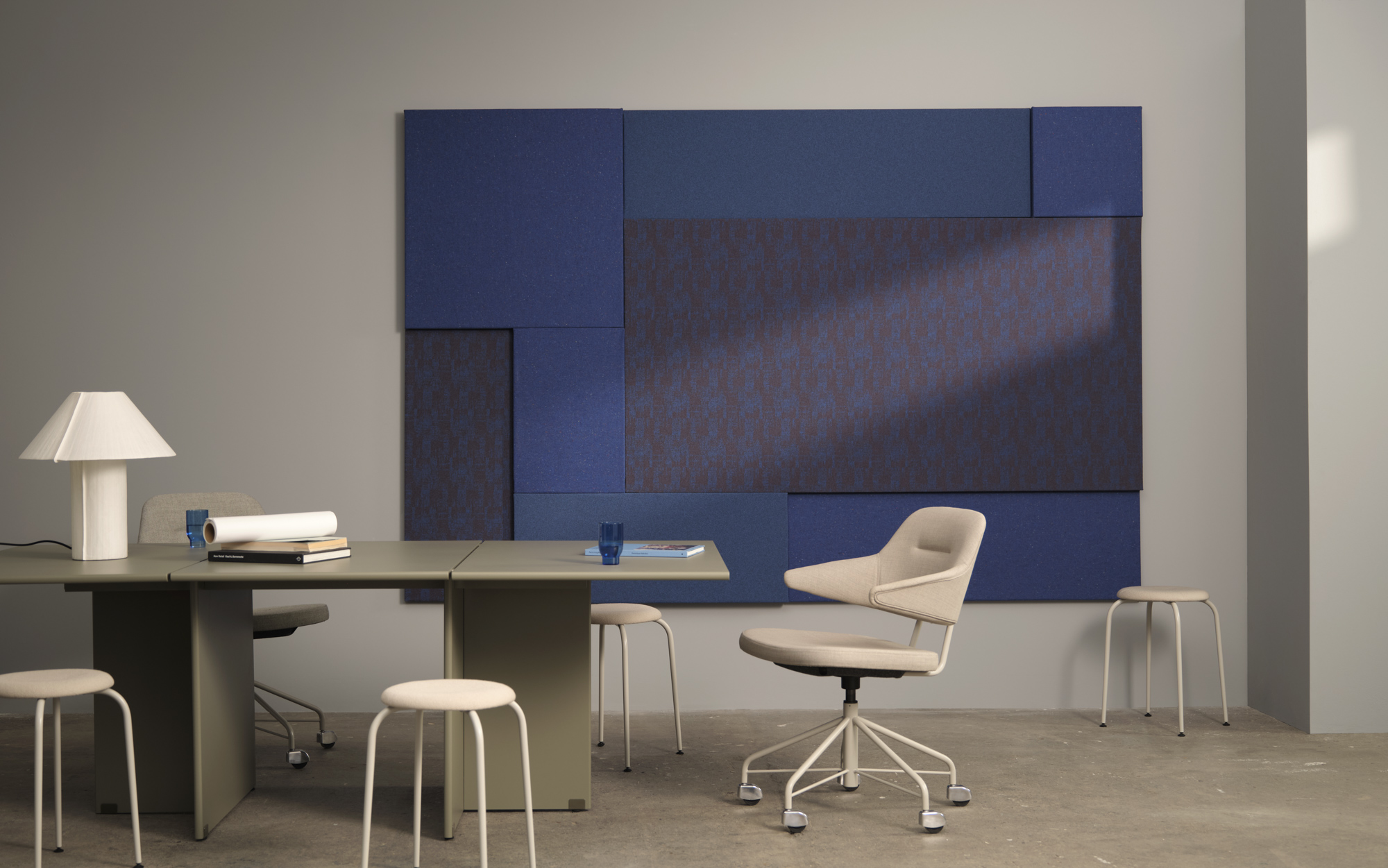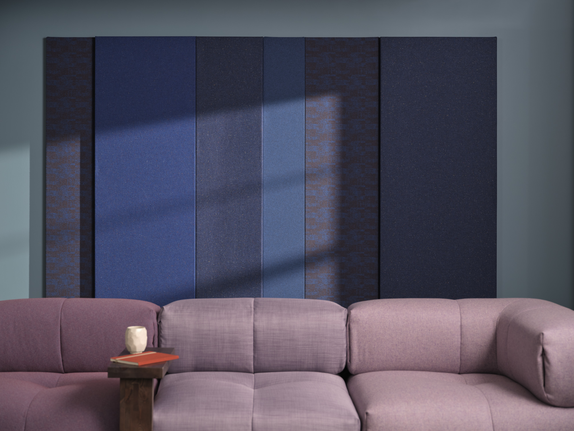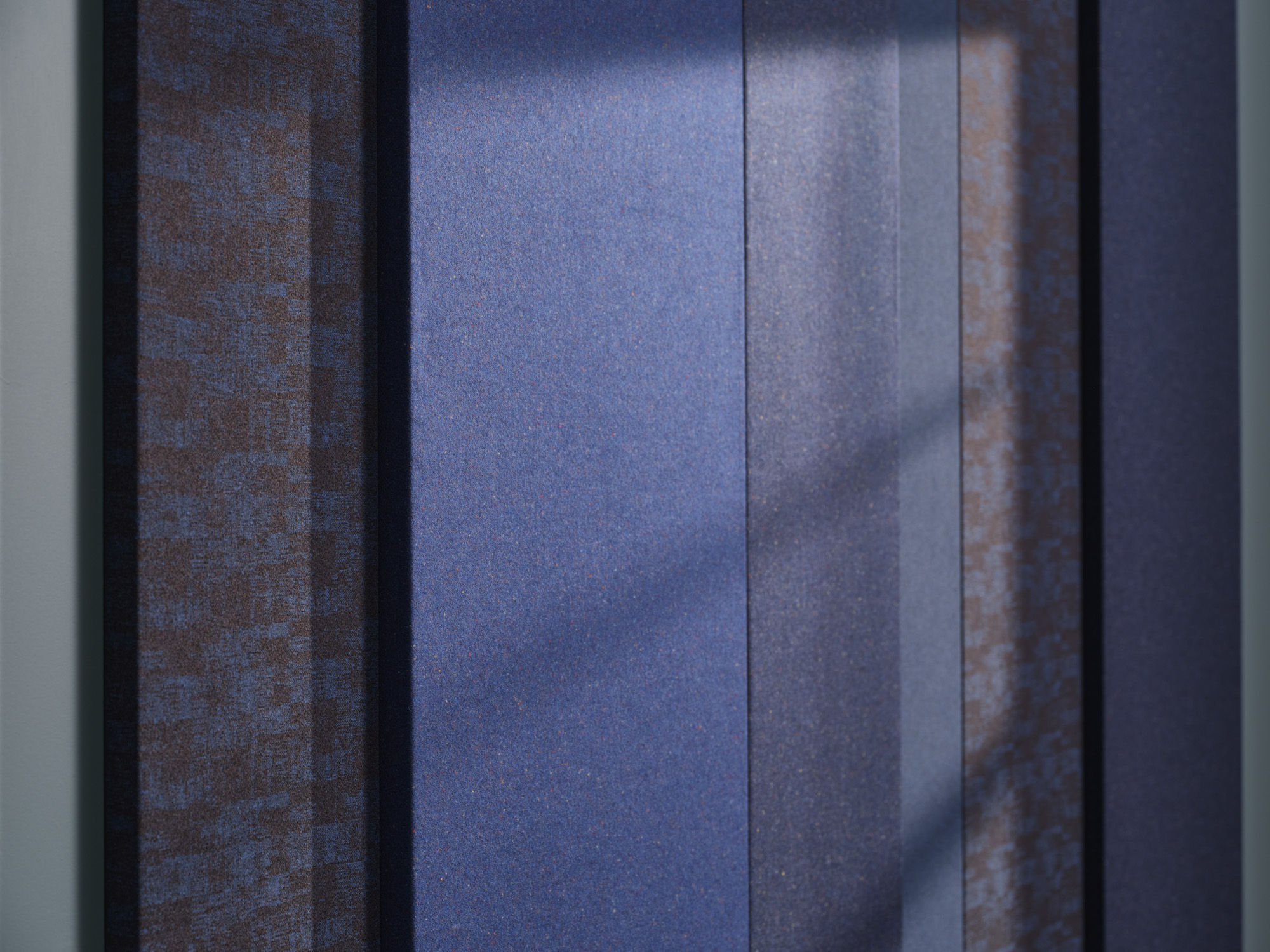 Back to all EDITsThis acoustic wall panel is both an eye-catcher and an effective tool for noise reduction. Each section is covered in a hand-picked acoustic fabric, with colours ranging from sky blue to midnight blue, and a mix of minimalistic and intricate weaves.